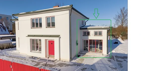 Suurte akendega ruum maja parempoolses küljes.